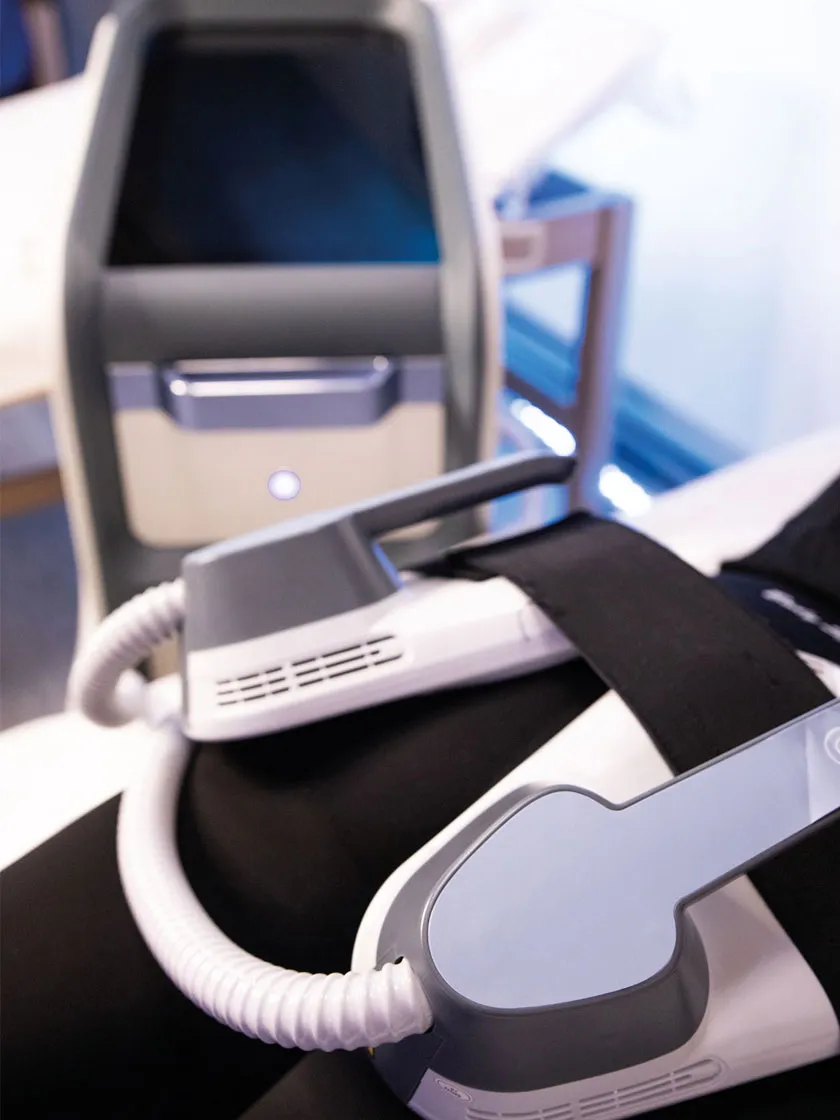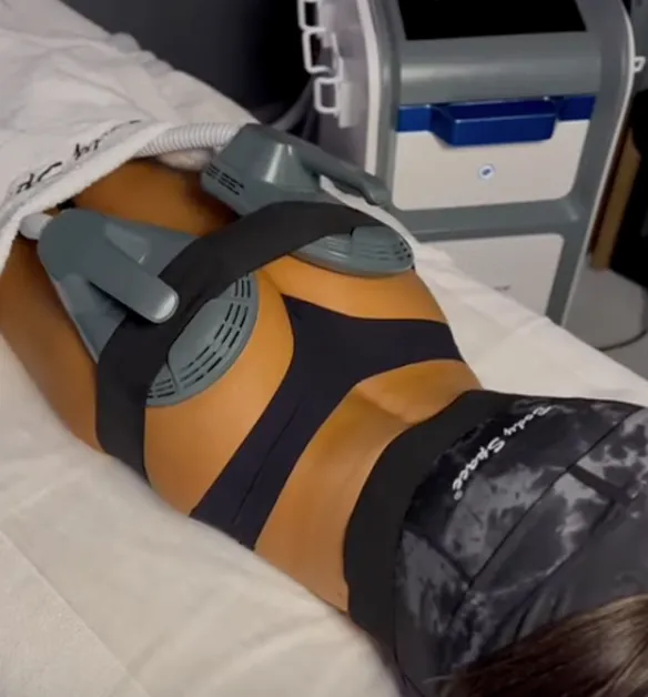 EMS BodySculpt RF uses high-intensity electromagnetic waves combined with radiofrequency to generate around a thousand muscle contractions per minute, effectively simulating 30,000 crunches or squats in just 30 minutes.